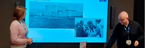 Kristin Flem Velle og Frode Longva Hansen foran bilde av sykehuset da det ble tatt i bruk i 1971.
