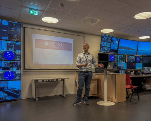 Innleder og omviser var Arnt Myrheim-Holm som er studieleder i nautikk ved IHB ( institutt for havromsoperasjoner og byggteknikk). Det er i underkant av 300 bachelorstudenter ved det maritime studiet ved NTNU fordelt på 130 ved nautikkstudiet og 150 studenter på shipping managment. Kvinneandelen er 12% på nautikk og omlag 50% på shipping managment.